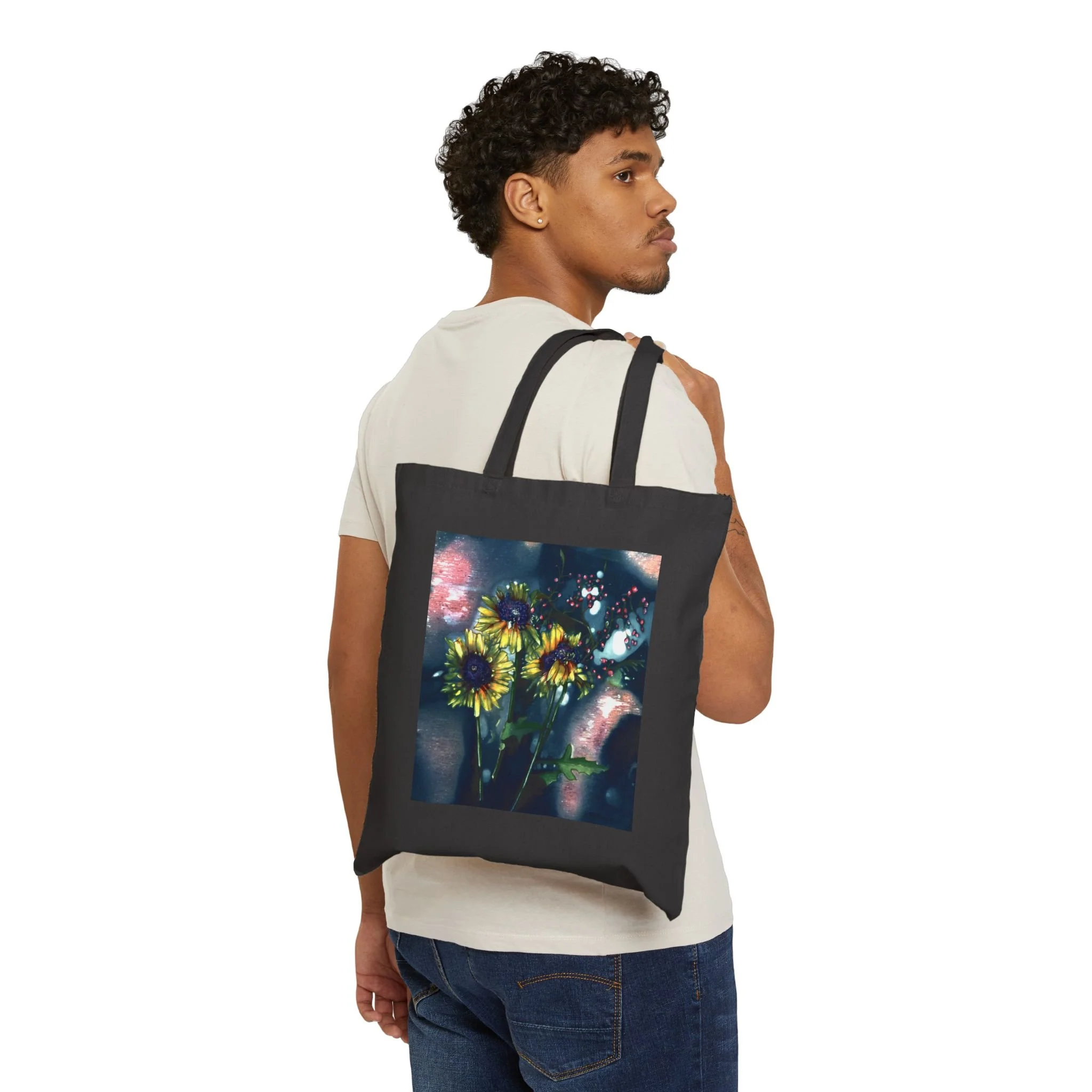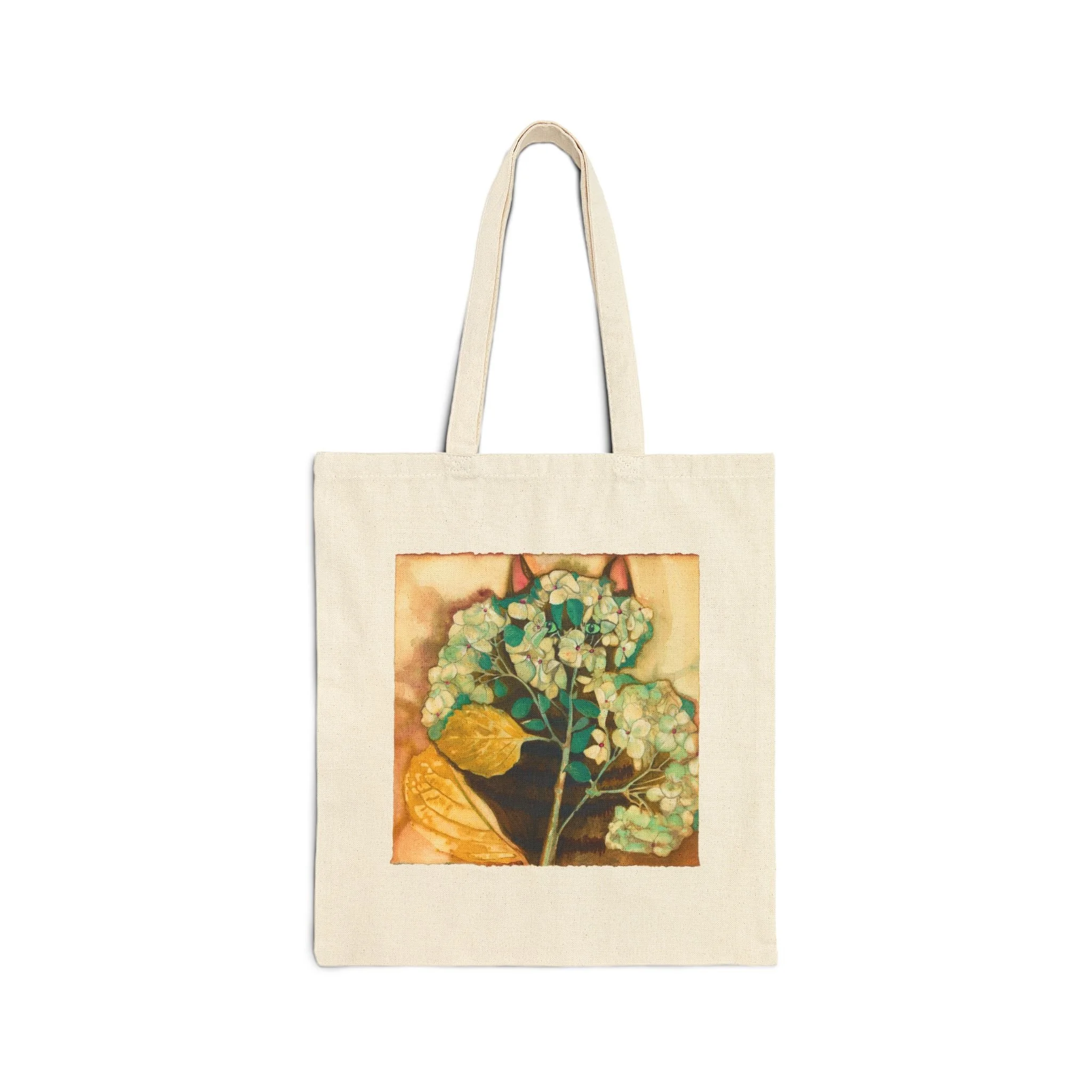 A hand-held canvas tote that carries a small story with every errand. Printed with a whimsical interpretation of Alice in Wonderland's Cheshire Cat hiding in the hydrangeas, viewers will smile once they see the green eyes peering out.