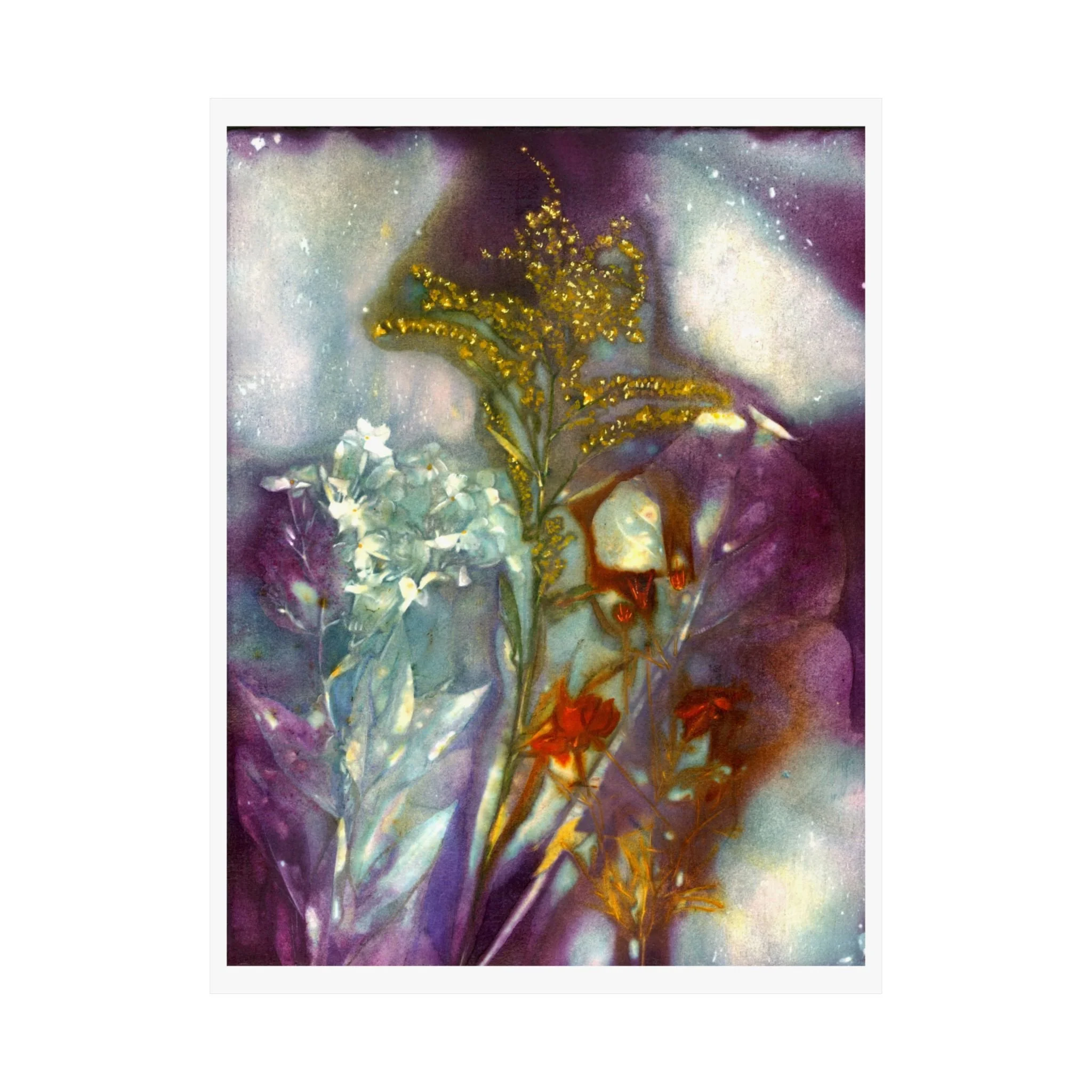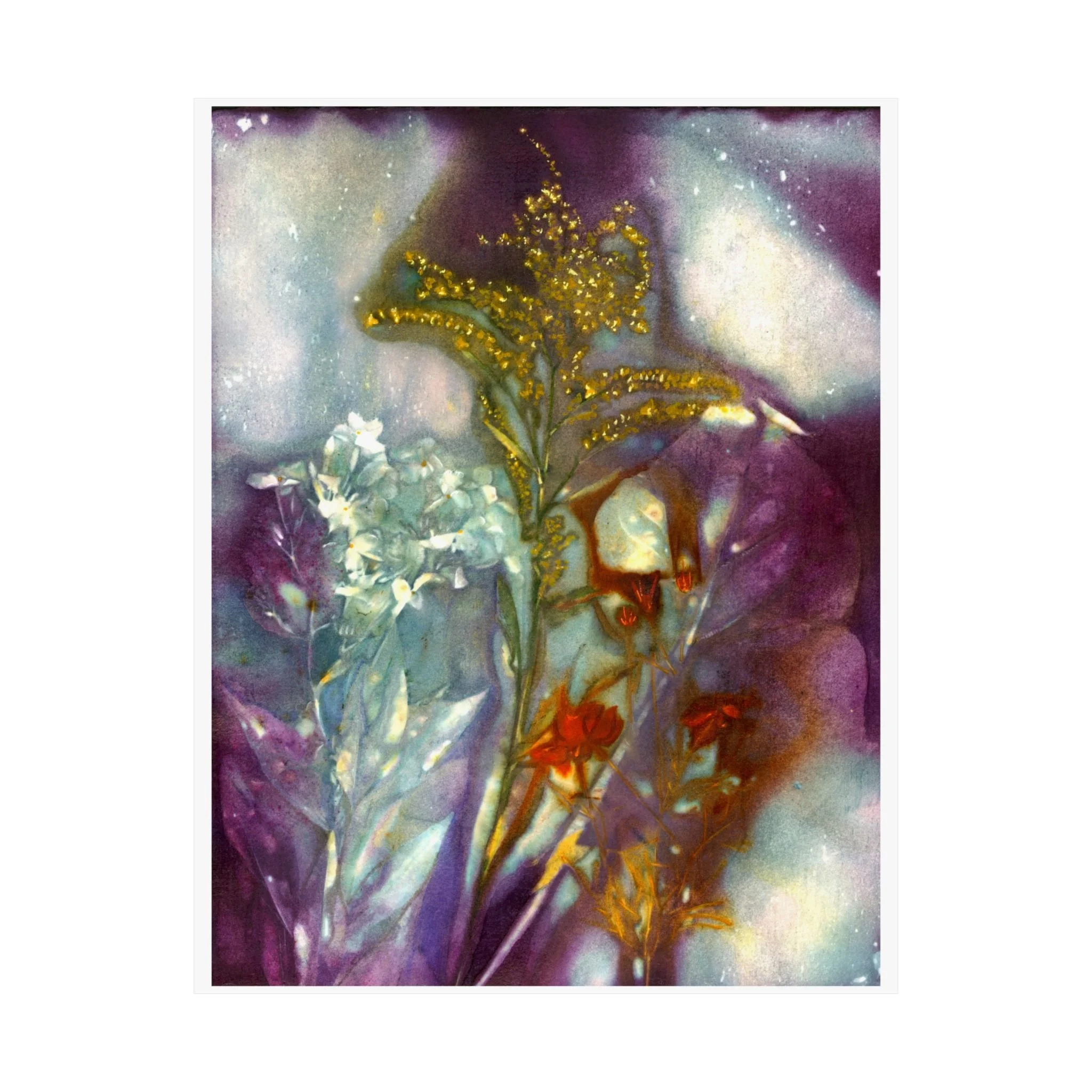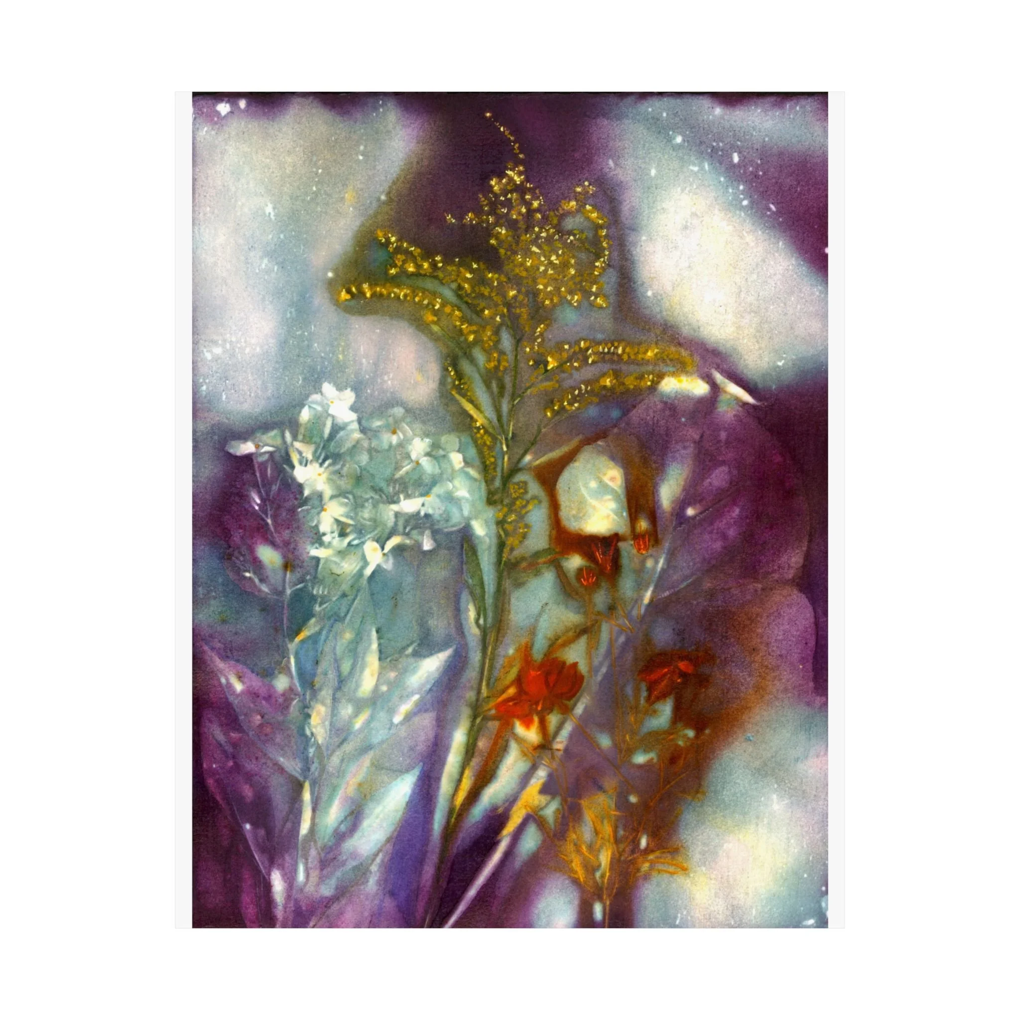 A delicate and ethereal floral composition featuring a variety of flowers set against a dreamy, soft-focus background in shades of purple and blue. The central plant is goldenrod, flanked by clusters of white phlox on the left and coreopsis toward the bottom right. The flowers and leaves have an almost translucent quality, blending harmoniously with the misty, atmospheric backdrop that enhances the overall sense of depth and softness. The painting combines both fine detailing in the flowers and a flowing, abstract treatment of color and light. For the best presentation, I recommend framing with an acid-free matt.