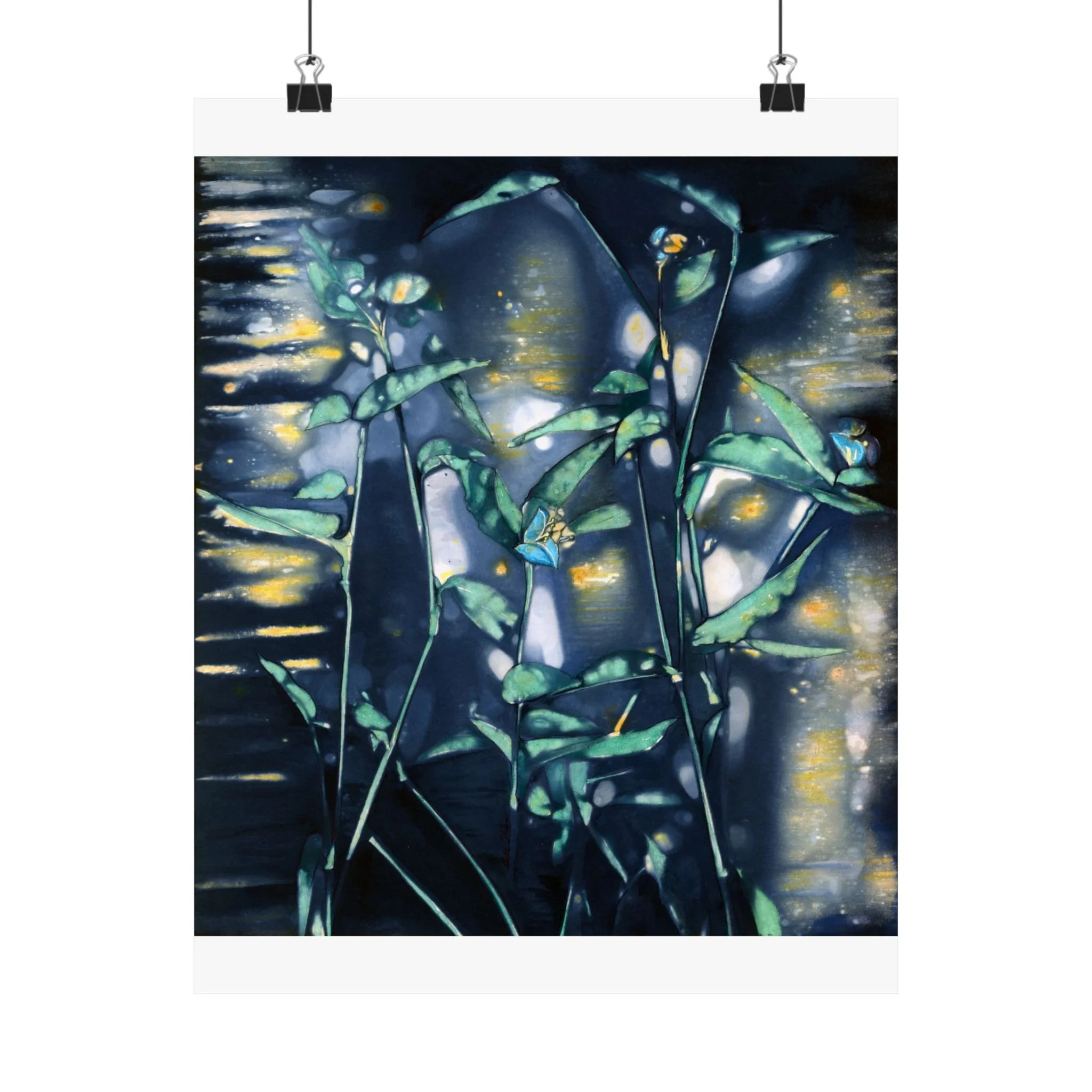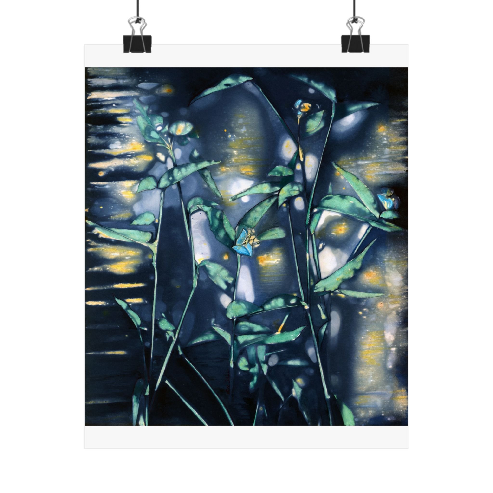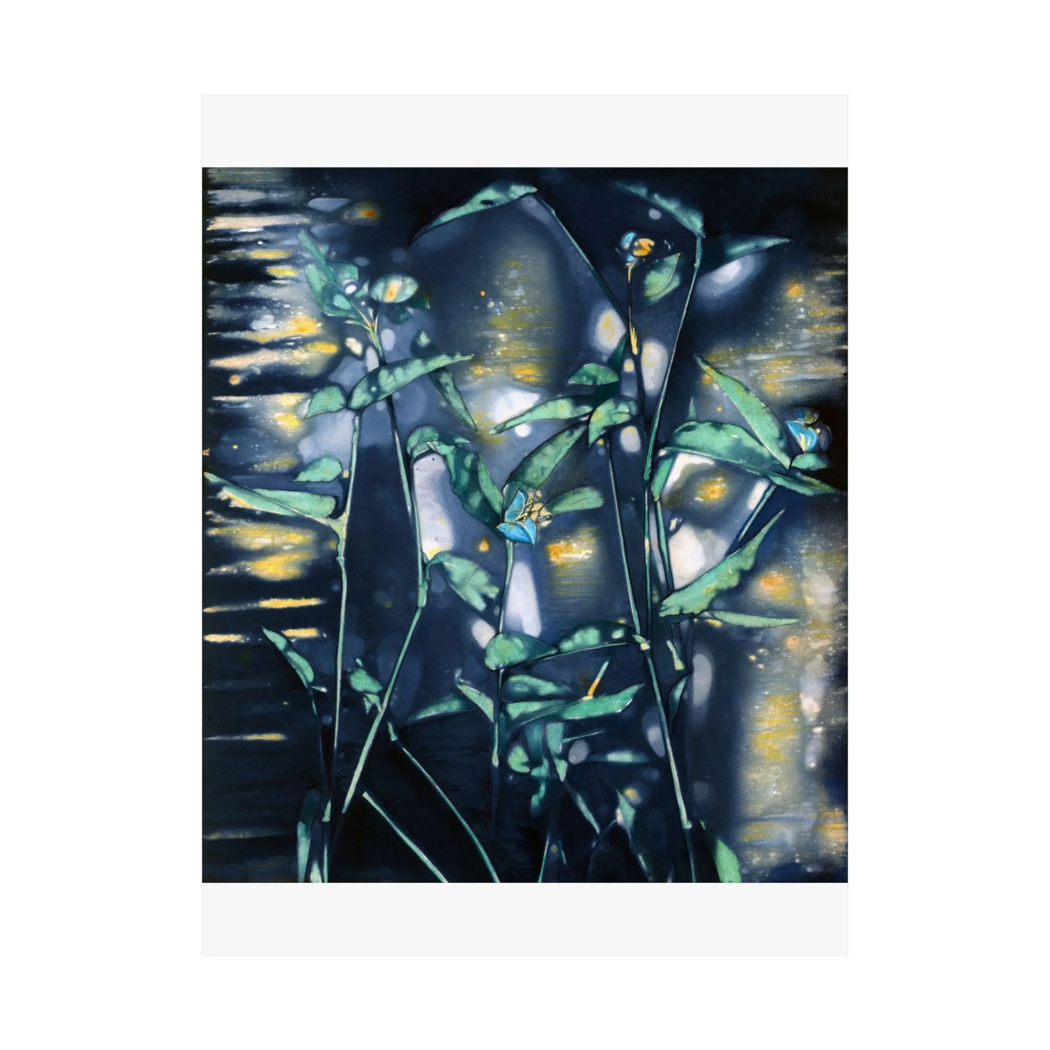 This print brings a quiet, midnight pond to your wall—soft moonlit blues, deep greens, and scattered golden reflections that catch the eye without shouting. The composition feels like a slow, reflective walk along reeds and water: intimate, slightly mysterious, and calming. It slips easily into a reading nook, studio, or bedroom where low light and hushed tones set the mood. For collectors of moody botanicals and lovers of atmospheric art, this print adds depth and a contemplative pause to everyday spaces. For the best presentation, I recommend framing with an acid-free matt.