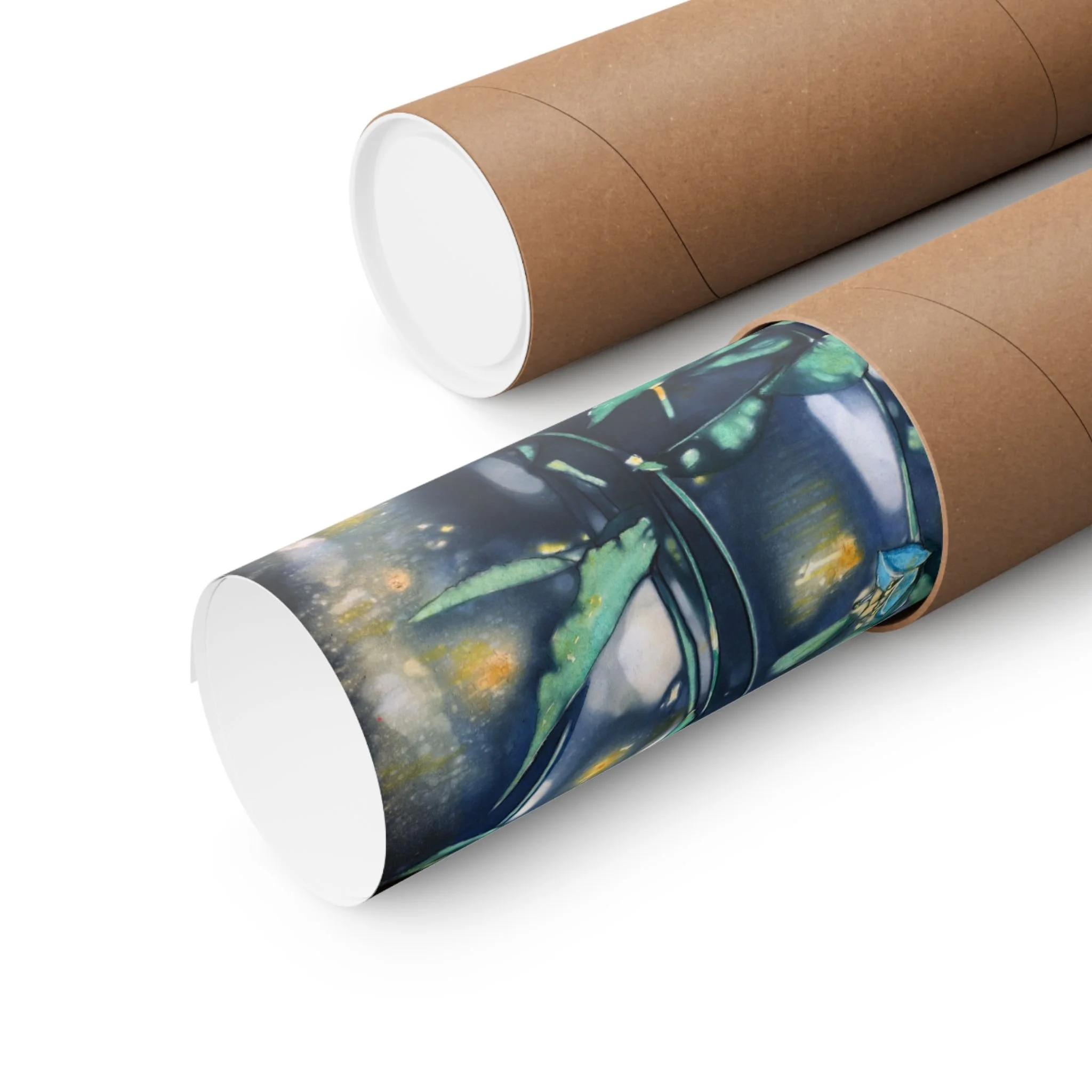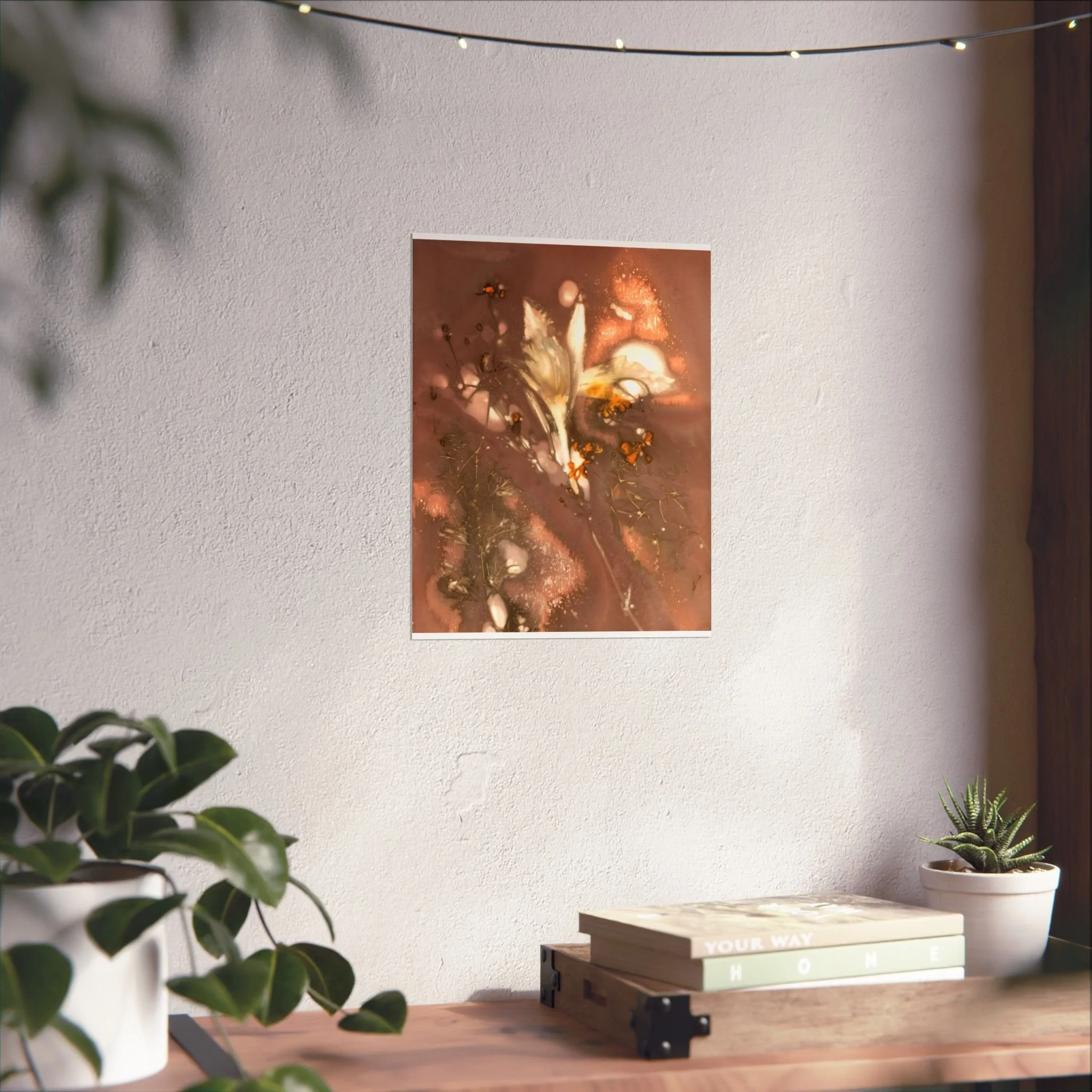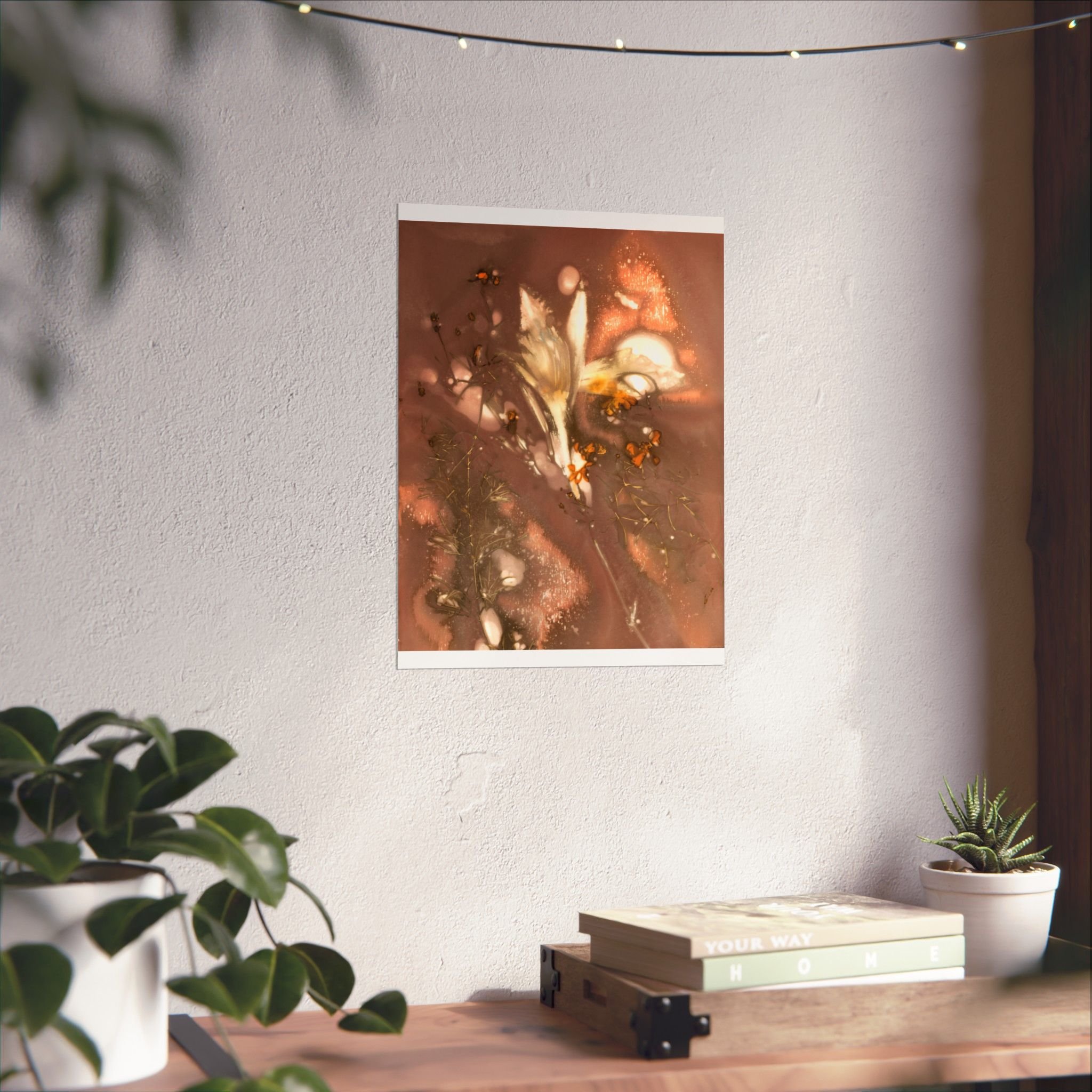 This print brings a quiet, midnight pond to your wall—soft moonlit blues, deep greens, and scattered golden reflections that catch the eye without shouting. The composition feels like a slow, reflective walk along reeds and water: intimate, slightly mysterious, and calming. It slips easily into a reading nook, studio, or bedroom where low light and hushed tones set the mood. For collectors of moody botanicals and lovers of atmospheric art, this print adds depth and a contemplative pause to everyday spaces. For the best presentation, I recommend framing with an acid-free matt.