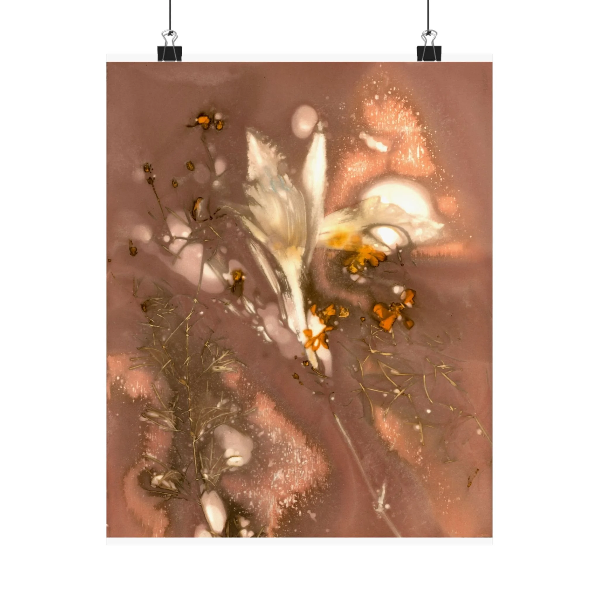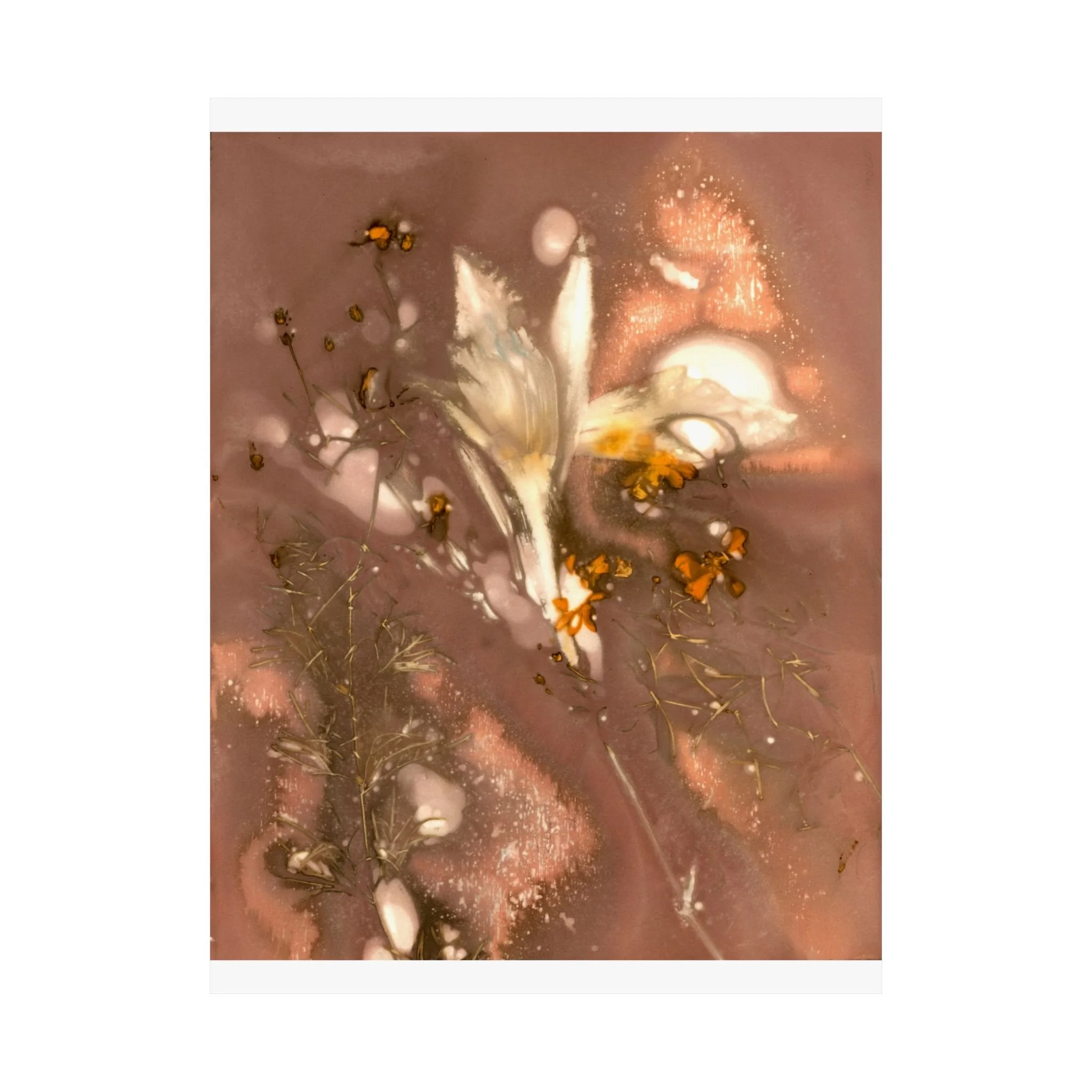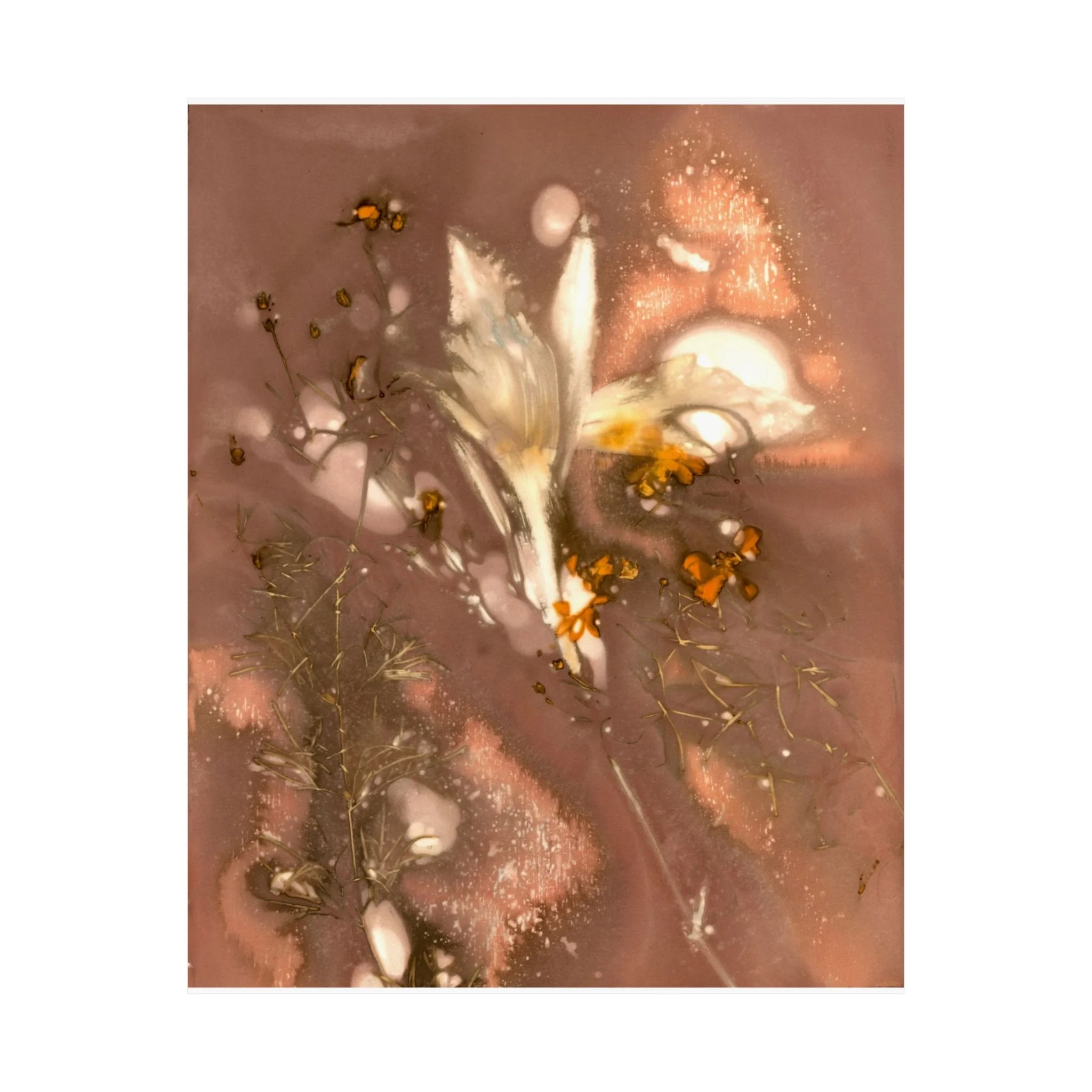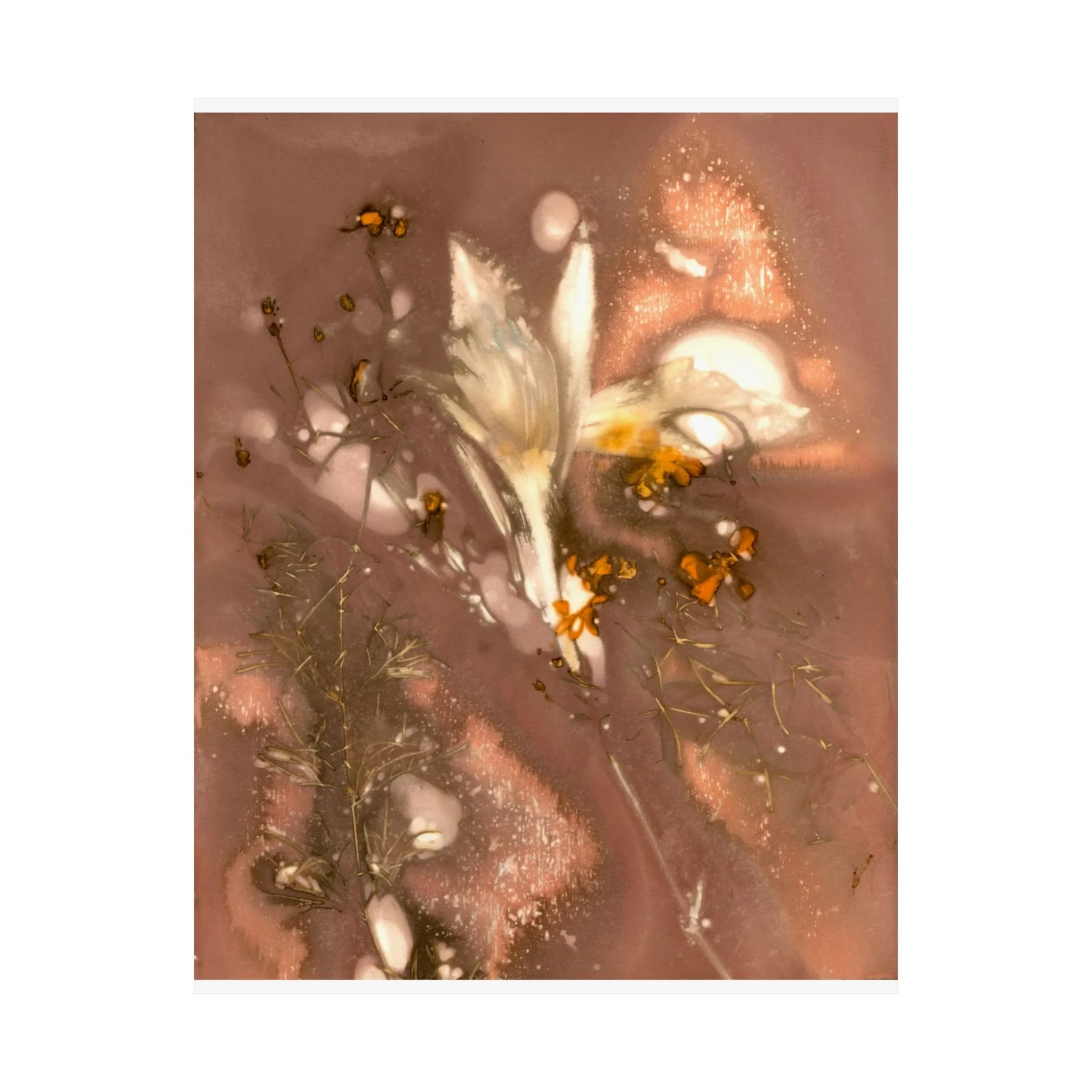 An ethereal and delicate composition of muted brown tones featuring translucent, ghostly floral forms with slender stems and small blossoms, rendered in shades of white, orange, and pink. The flowers almost fade against the background, blending fluidly with tan and peach hues creating a dreamy atmosphere. The overall effect is one of subtle beauty, with a focus on the interplay between light, shadow, and texture that gives the piece a sense of fleeting presence and natural elegance. For the best presentation, I recommend framing with an acid-free matt.