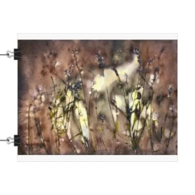 The print depicts delicate lavender flowers with slender green stems and small purple blossoms. The flowers blend into a warm, muted background of mauve and beige tones with bright patches of light that create an ethereal glow. This work was completed at Weir Farm National Historical Park and captures a fleeting impressionistic moment of tranquility. This work is presented here vertically due to the limitations of the storefront. Just turn the print horizontally to matt and frame.